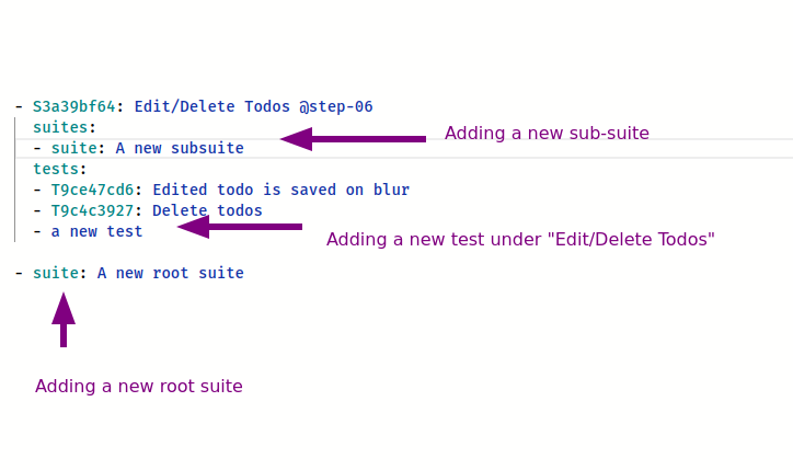 - S12345678: Existing suite suites: - S22345678: Existing sub-suite 1 suites: - suite: A new sub-sub-suite!Please note that we indent our data with 2 spaces (